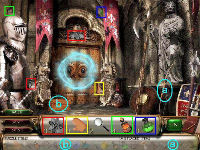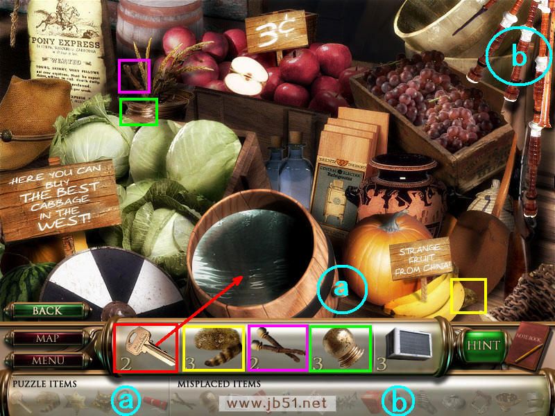 在店里找齐物品3和4,钥匙和水獭帽子各差一个部分。(场景四得到红酒开瓶器用在a处,水放掉后得到钥匙的最后一部分;b处放红袋子,是在场景三获得的。)图3.12