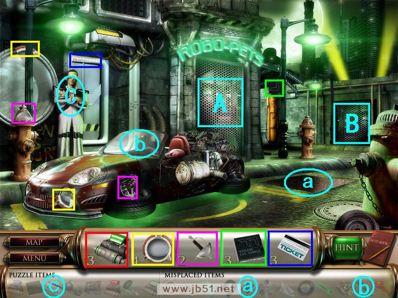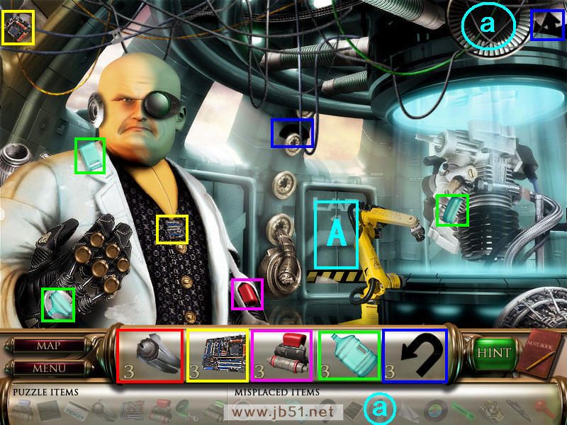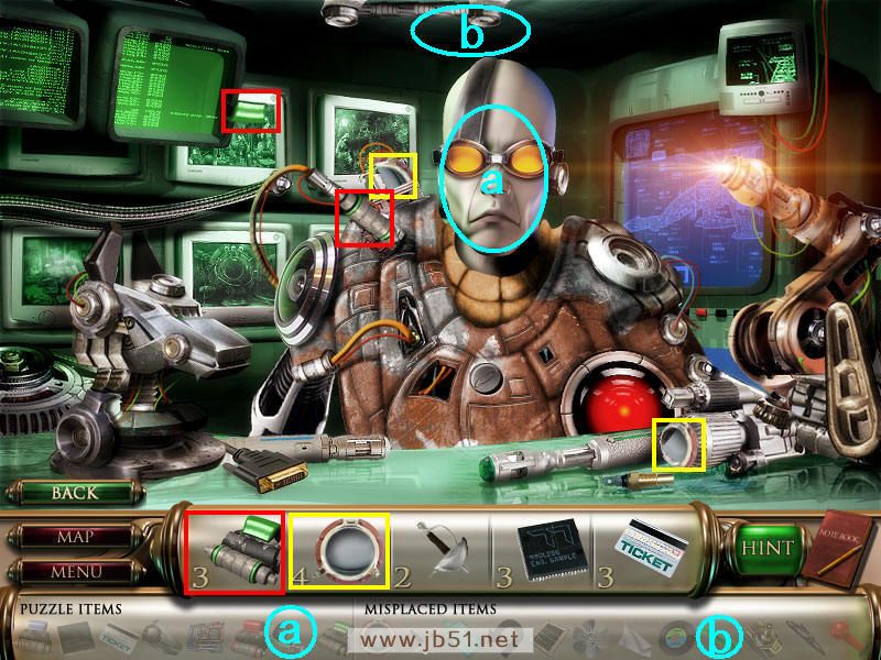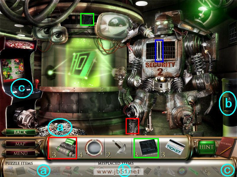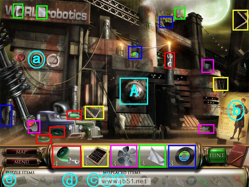 在这个图中可以找齐所有的五件物品,并且把前面得到的圆形玻璃窗和剑分别放在a、b处。然后点A处进入一个拼图,按照颜色拼出三个机器人,如果觉得难就直接点左下角的SKIP吧,嘿嘿~拼好后先把绿色的头脑芯片c装在绿色机器人头内,然后去场景四。(a圆形的玻璃和b剑都在场景一得到的;道具c在场景一得到,连同后面找到d、e三种不同颜色的头脑芯片,都要装在A处相应颜色的机器头上。)图5.3