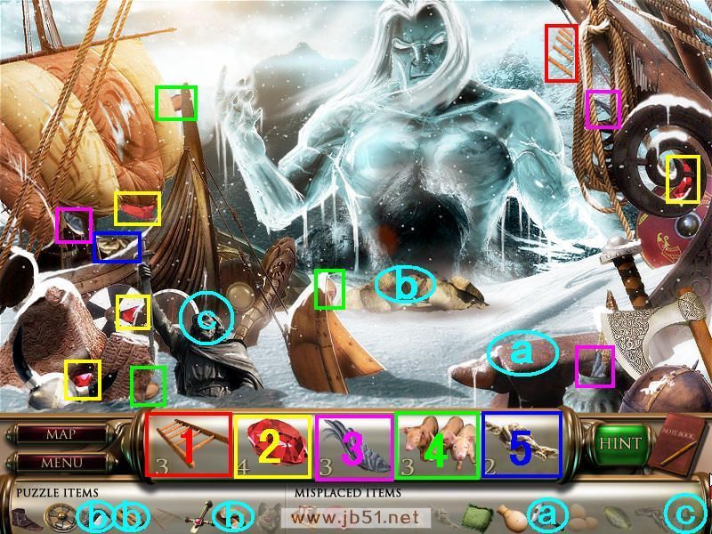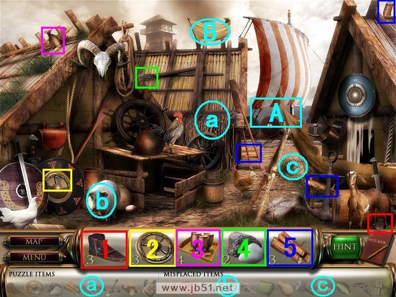 答:第一大关:VIKING AGE 场景一 VILLAGE: 先在下面图中找到所需要物品1、2、3、4的一部分,物品5找齐,然后在A处去另一个场景。(青色框内道具是在后面几个场景中找到再回来摆放的,a梯子在场景三找到放在a处,然后查看B处的旗子得到一页算术题,... >>详细