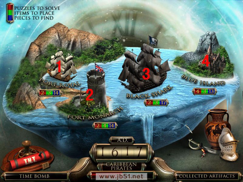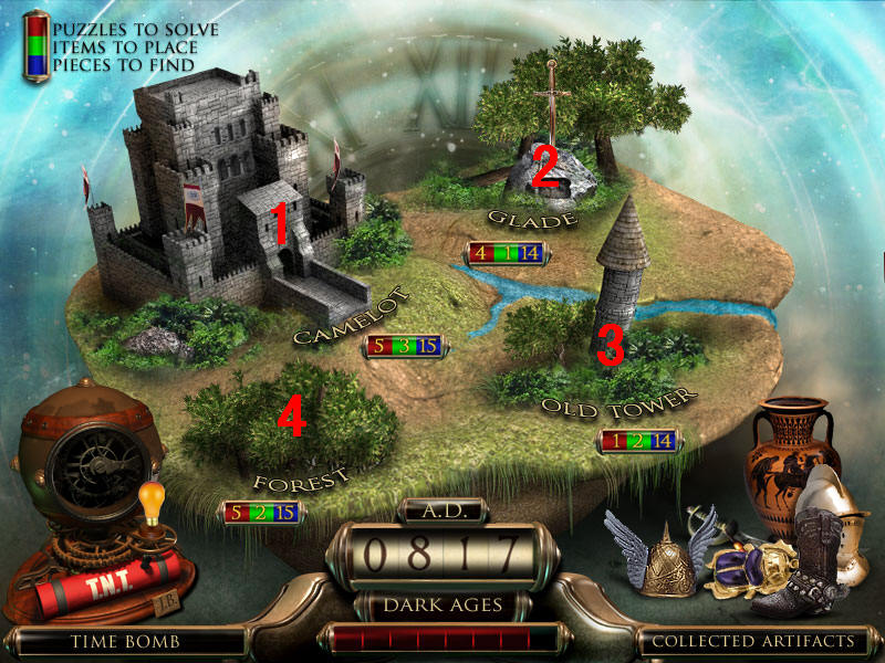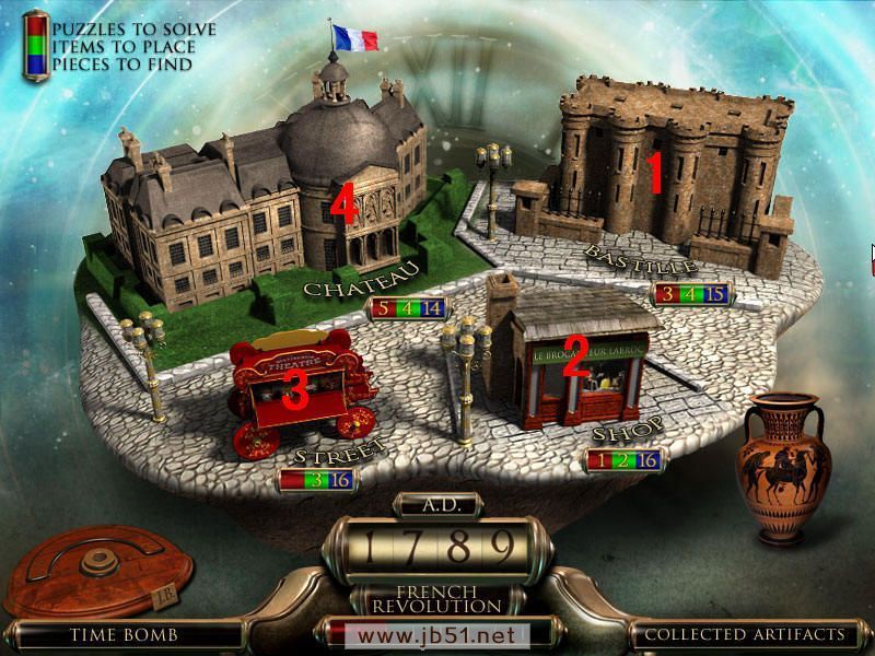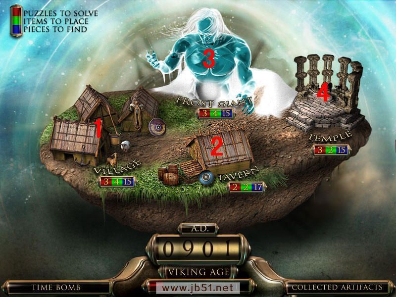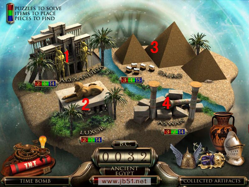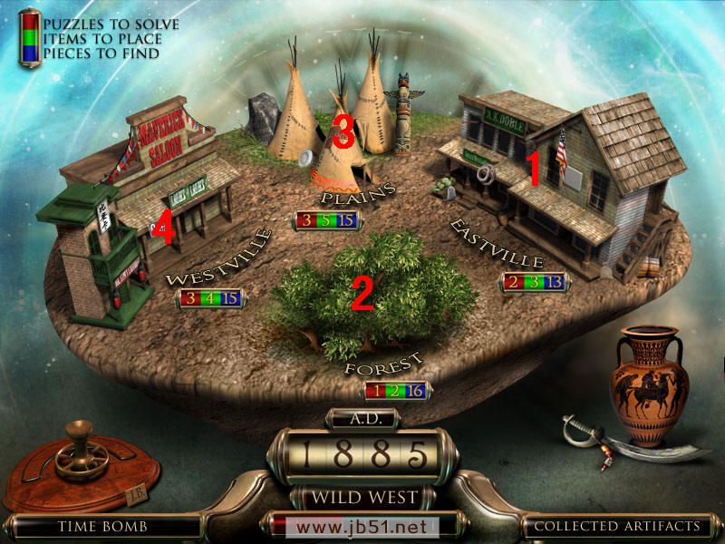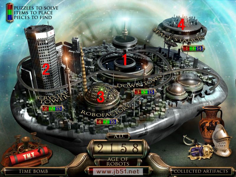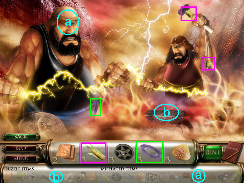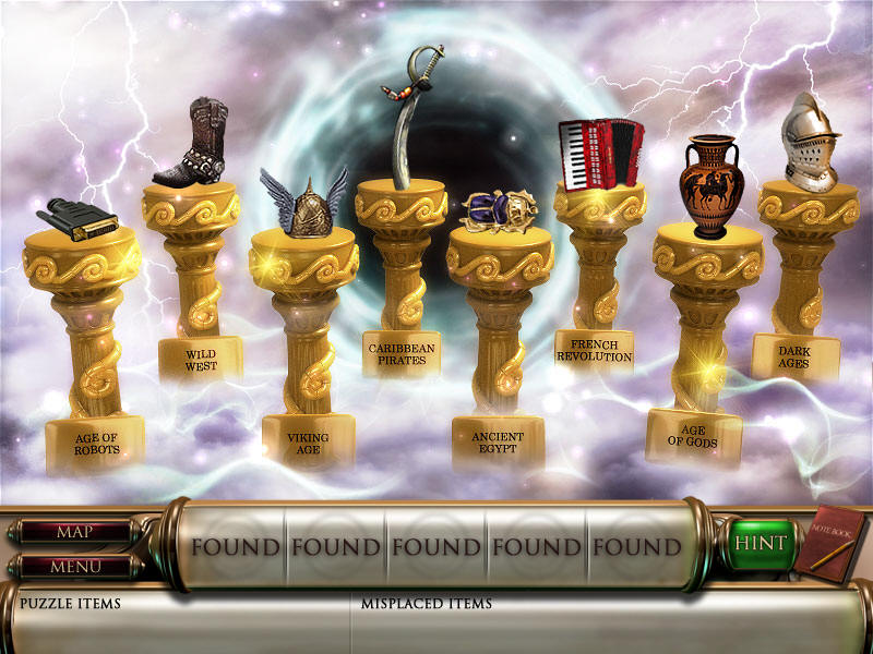 最后到场景一,人物雕像放在右边花瓶上,去独眼巨人那里,皮帽子给左边的巨人,把最后得到的打铁用的砧角给右边的独眼巨人,本以为就结束了呢,可是回到场景一宙斯那里,从天门进去,最后一个小游戏啦,这个原理很简单,就是你玩过的八大关,每关都获得时间机器的零件和不属于这个时代的物品,分别在大地图的左下角和右下角表示。而右下角的物品,就是小游戏中需要排列年代的物品。完成图如下:图8.5