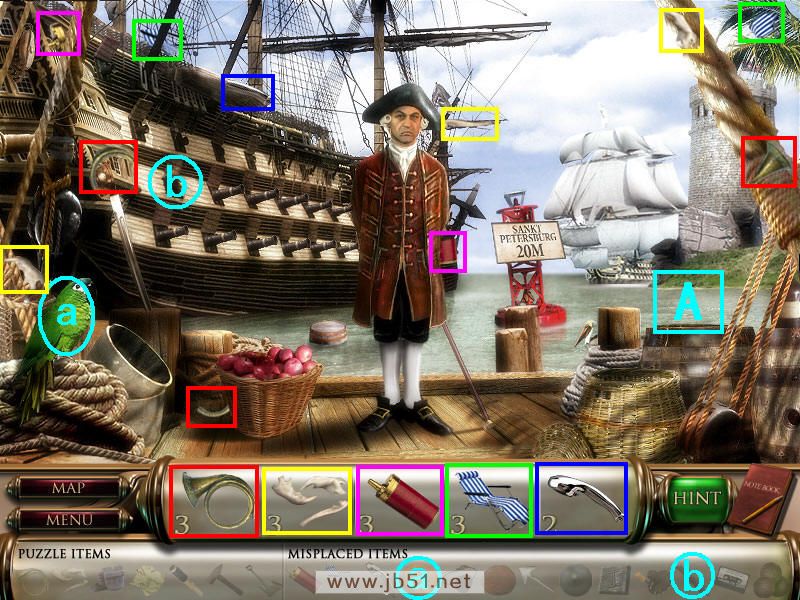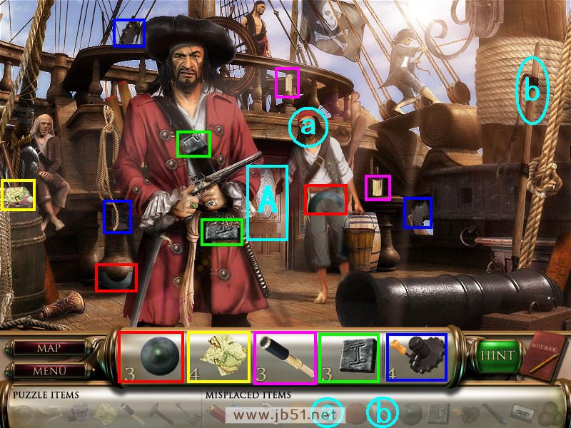 找到图中的物品,另外把前面得到的眼罩给a处的海盗,金属箭头放在b鱼叉处,然后通过A处去船长室。(眼罩和箭头都在场景二获得。)图4.3