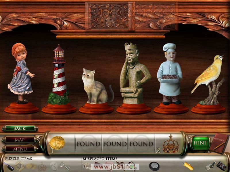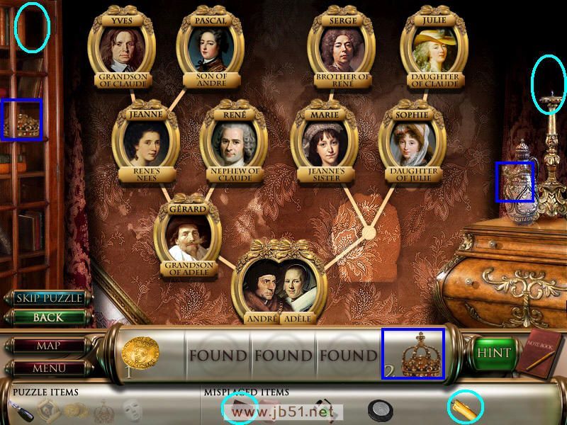 密室里也有一个排列祖谱的小游戏,但是现在还不能玩,因为缺少场景一的那个画像,这个比较麻烦也可以直接点左下角的SKIP跳过。先找齐皇冠的两部分,顺便把书和蜡烛放回原处。图2.43