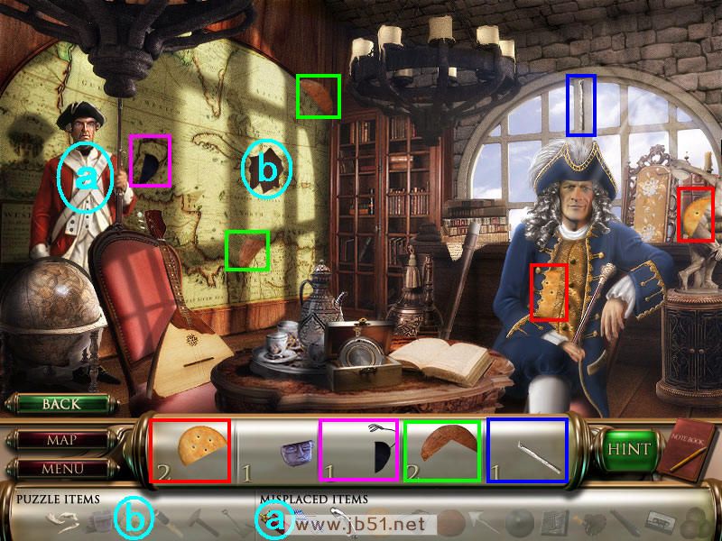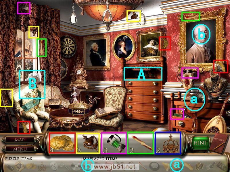 先找到物品2、3、4,最后金币剩一个部分,皇冠暂时找不到。道具a地球仪已经获得的话放在a处,b假发放在b画像处。在A处是个小游戏,但是需要回场景一才知道如何排序。图2.4