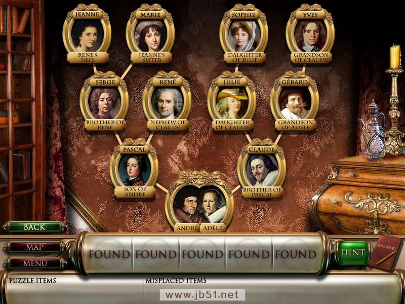 最后回到场景四的密室,先把画像放在空缺的地方,然后按照画像上的人物亲属关系排列。每个画像上面是人名,下面是和其他人的关系,关系不外乎儿子、女儿、侄子/女、孙子/女,E文不好的直接跳过,哈~完成后第二大关就过啦。完成图:图2.44