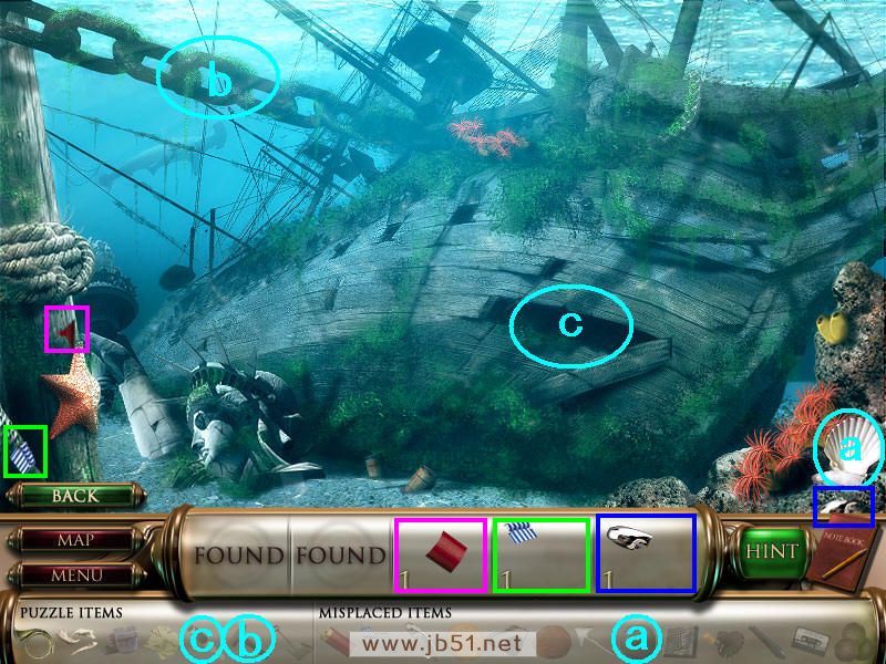 在海底找齐物品3、4、5,这个场景只剩下机关了,物品全找齐了,然后去场景二。(a处贝壳需要的黑珍珠,在场景三得到;道具b锤子在场景四得到,用锤子砸b处的铁索,c处才会出现小水怪,它需要场景三获得的望远镜,才能解除海盗手里黑色的诅咒。)图4.11