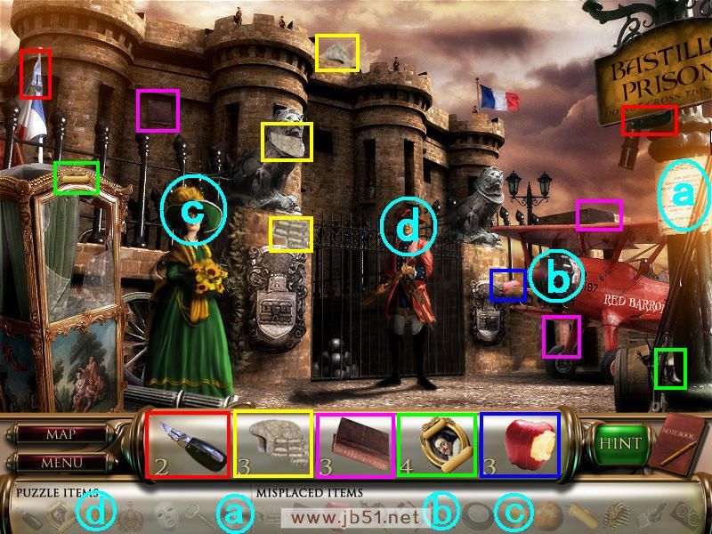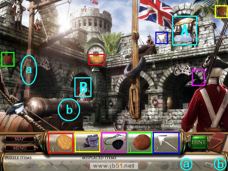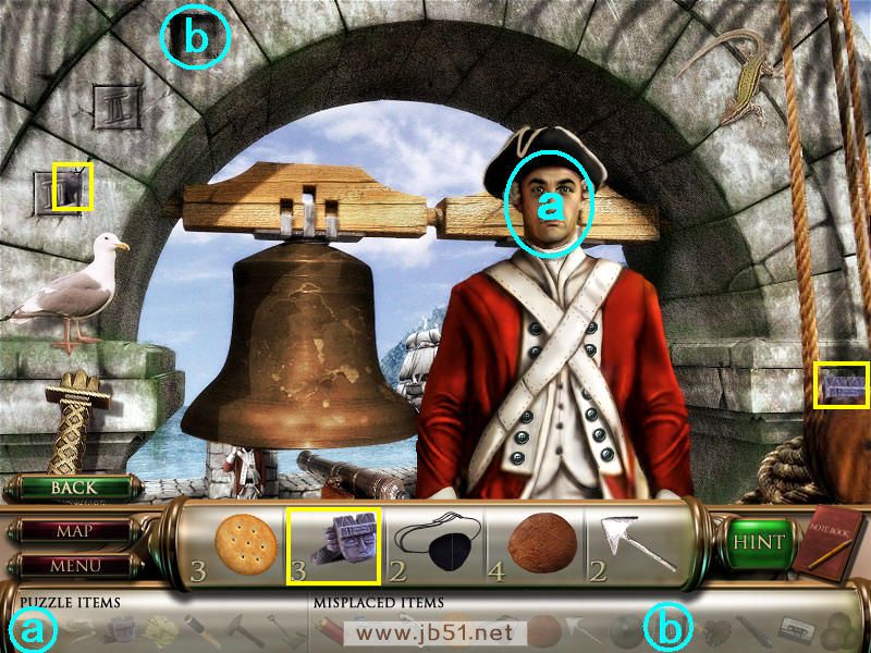 找齐物品饼干后再点穿蓝色衣服的长官,跟他对话才知道地图上缺少了一片,要你帮助他。在图中找齐除了石像之外的四个物品,顺便把得到的道具a子弹给a处的守卫,然后去场景三。(道具a子弹在场景一获得;b地图碎片要完成场景一和场景三才可以得到。)图4.22
