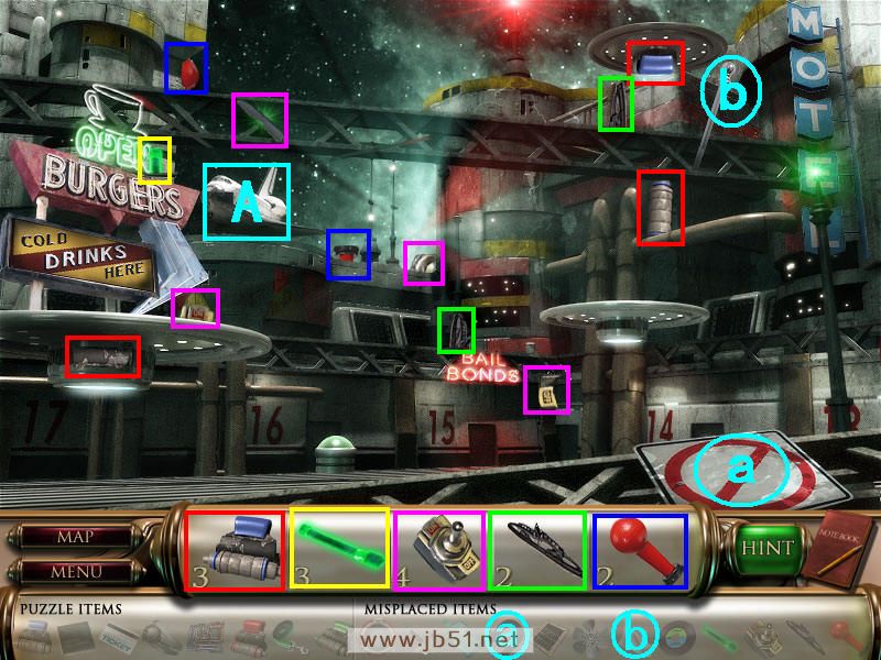 在商店里找齐物品2,物品1还差一个部分了,再去上图中B处的地图。(店主需要的狗绳在场景三获得;最上面b处缺少绿色的灯管,要完成场景二、三,最后才能在场景四获得。)图5.11