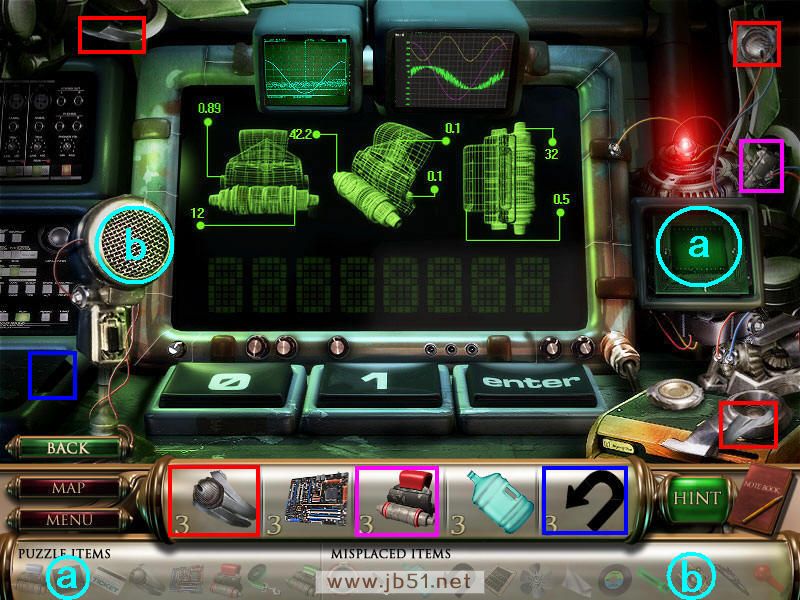 然后来到场景四,点中间的飞船,来到了一个空间站里,找齐绿色灯管缺少的部分,并把程序芯片放在a处,这样出口就打开了,再把光盘放在左边的b处,场景四就完成啦~图5.41