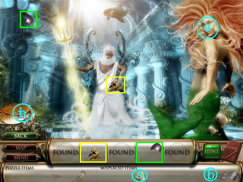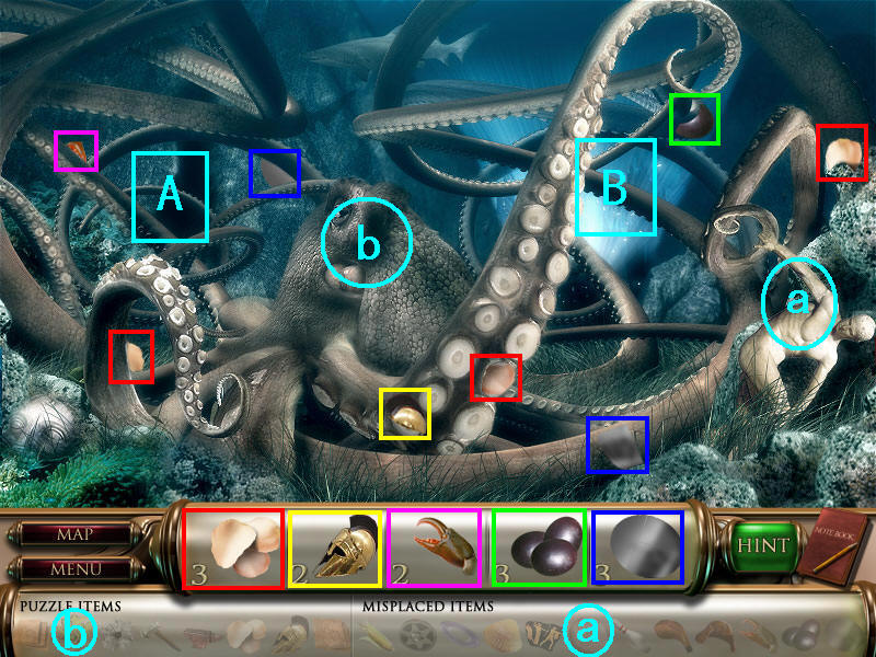 完成拼图后,回到章鱼的图通过B处去另一个房间,得到物品2头盔的最后一部分,和物品4的最后一部分。道具贝壳是右边美女的耳环,刚找齐的蟹钳也放回左边螃蟹处,这样场景四就结束啦。(a贝壳在场景一已经获得;b蟹钳就在本场景获得。)图8.42