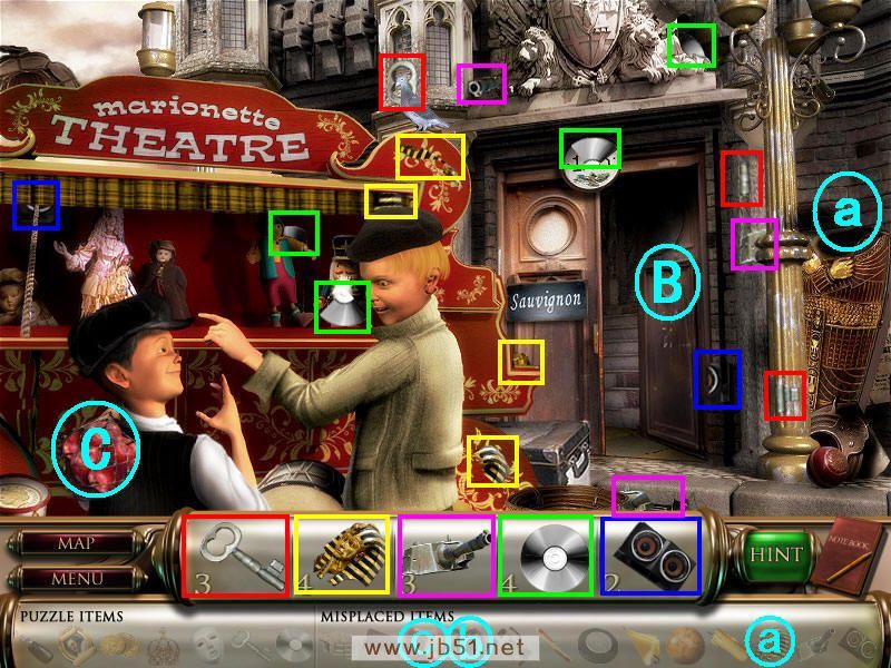 先找齐下图中的物品部件后,通过A处去下个地图。顺便把道具a鼓锤放在鼓那里,还有b报纸放在报亭里。(道具c那块黄布是在场景二找到的,给c处的人,他会用烟圈做出像暗号一样的东西,等一会就会记录在右下角的书里,这个也是用来完成下面图中的机关的。)图3.3