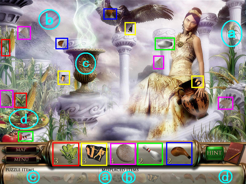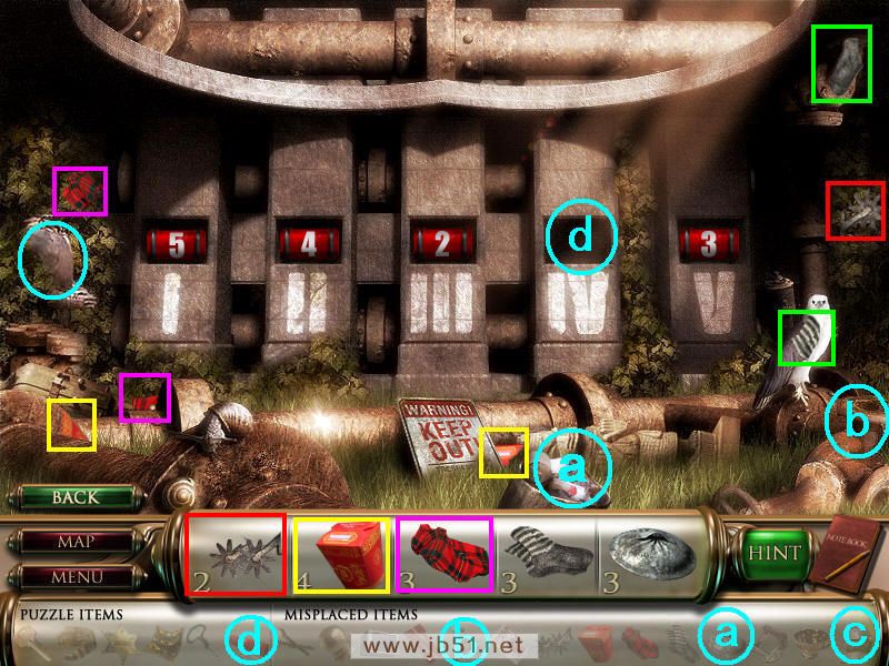 这个场景只有一个图,在图中先找齐1、2、4、5这几个物品,只有3木材差一个部分暂时找不到,用已经得到的道具鞋,打图中a处的猫咪,得到木材;青色框内的道具杯子也别忘了放在b处。这样所有的物品都收集齐了,只剩一个机关一个道具羽毛。(羽毛在场景3找到后放在c处,d处电话是一个机关。)图1.3