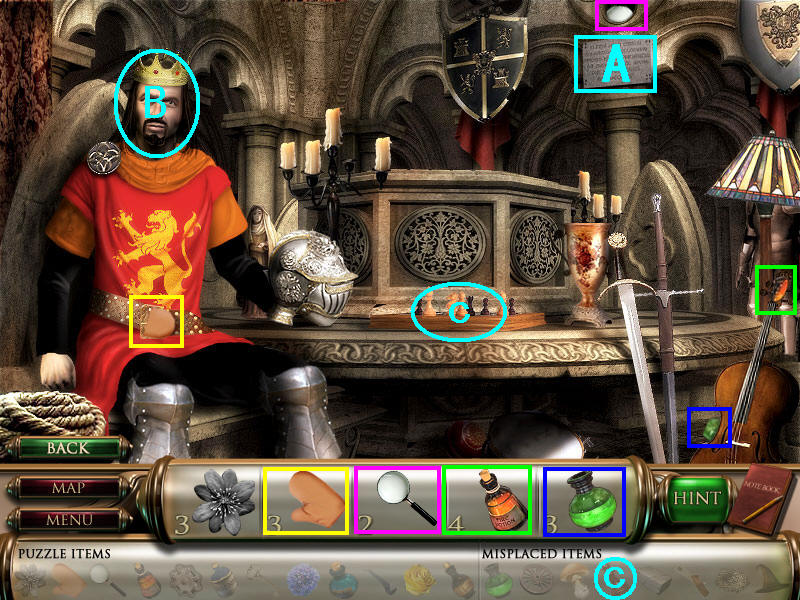 在宫殿大厅里,先点A处的石牌得到了一段话,后面机关所需要的吧。与亚瑟国王对话,得知他的剑被封在了石头里。这图里只找齐了物品3放大镜,再回到宫殿外面去B处的楼上。(再场景二破除石中剑之后再回来找B国王对话,才能得到进入场景三巫师房间的方法;道具c象棋在场景二获得。)图7.11