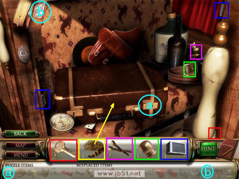 在马车里只把空调机找齐了,其他的还暂时得不到,不管它,先去店里面。(物品1也就是道具a钥匙需要完成场景四后才能得到,用在a处打开箱子可以得到水獭帽子的最后一个部分;b处腰带缺少腰带扣在场景四获得。)图3.11