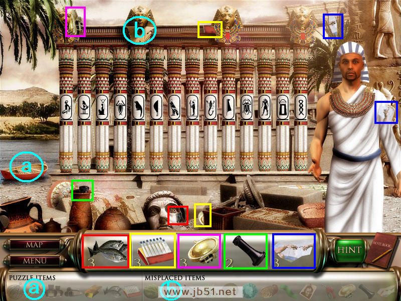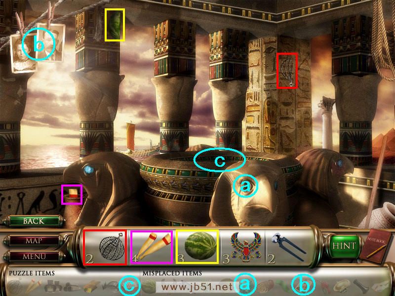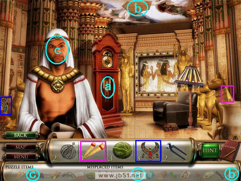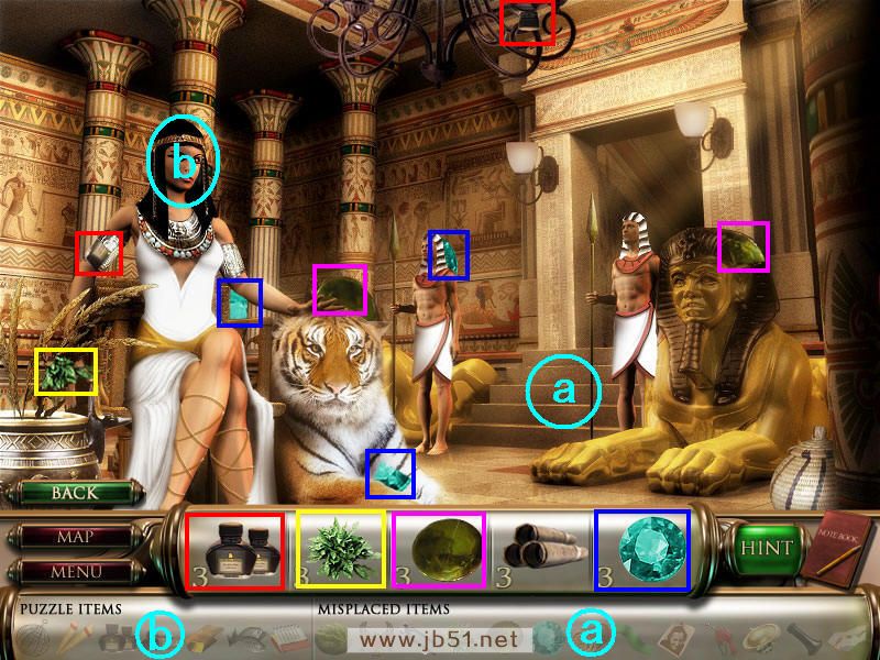 和左边的女王讲话,得到一些符号记录在笔记本上,用来解决场景四机关的。把a地毯放在台阶处,然后找到下面的物品碎片,只有物品5找齐了,回上个图通过B处去金字塔里。(a地毯在场景二已经获得了;道具b也就是物品4建筑图纸,要在最后完成这个场景金字塔迷题后才能找齐。)图6.31