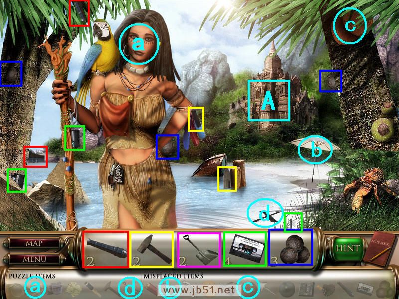 先把场景一得到a骨头给美女,然后会得到一串乱七八糟的字母,用来解迷船长室小游戏的。道具b椅子放在太阳伞下面,c椰子也挂在椰子树上。找齐物品1、2、5后,铲子差两个部分,磁带差一个碎片,去A处的寺庙。(道具a骨头和b太阳椅都在场景一获得;c椰子在场景二获得;道具d铲子需要完成场景二和三才能得到道具石像,开启这个场景里寺庙的小游戏,完成小游戏才找齐铲子。)图4.4