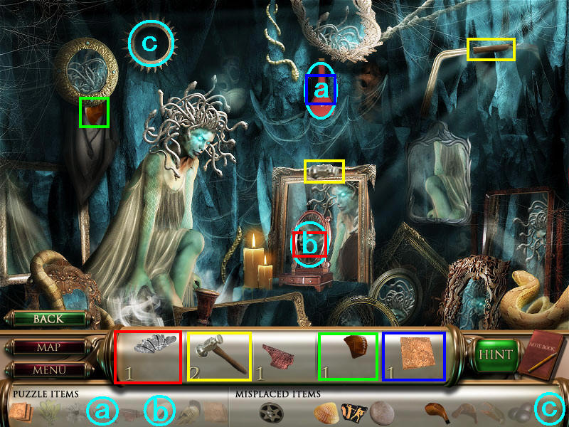 接着去场景三,把头盔给右边房间的男的得到物品3的最后一部分,然后去蛇女屋里把镜子放在左上的空缺处,场景三也结束啦。