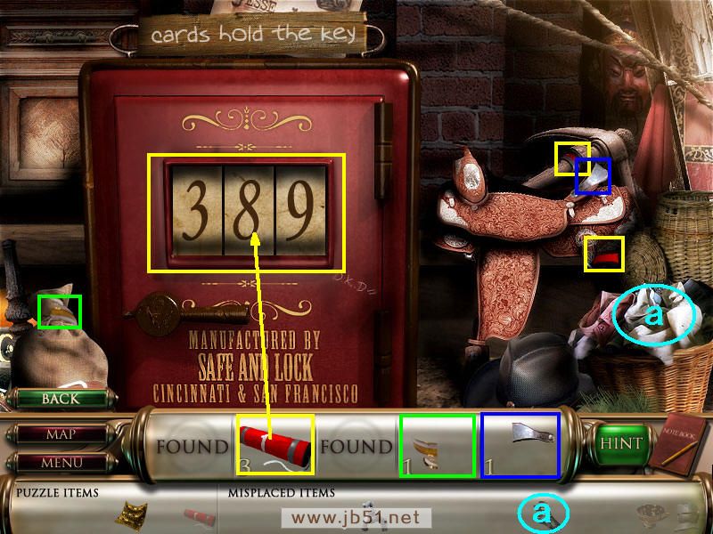 来到场景四,把警星给守卫,就进入保险箱存放的地方,先找齐物品杯子和头盔,但是标有数字1的炸药还差一部分。中间的保险柜需要密码,密码就是在这个场景的拼图中,扑克牌的数字,我玩的时候是573,打开保险箱得到炸药的最后一个部分,别忘了把道具脏袜子放在脏衣服筐里,这个场景也结束了。图3.42