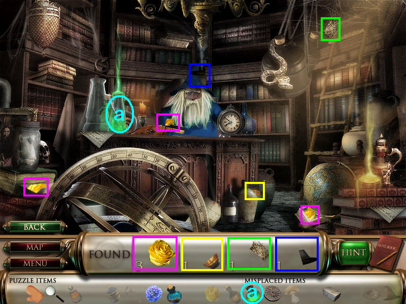 去场景四,把蓝色的花种在牌子处,并用蓝色瓶子的海水药剂浇灌它,再黄色瓶子的药水用在树干上,可以进入到树洞里了。在树洞里找齐物品3和5,用手套拿开烧热的锅得到物品2的最后一个部分,这个场景所有物品都找齐了。使用放大镜看沙发上的书,得到如何使三种花快速开花的方法,记录在笔记本上,最后把帽子放在头模型处,场景四就完成了。(a手套和b放大镜都在场景一获得;帽子在场景三巫师房间获得。)图7.41