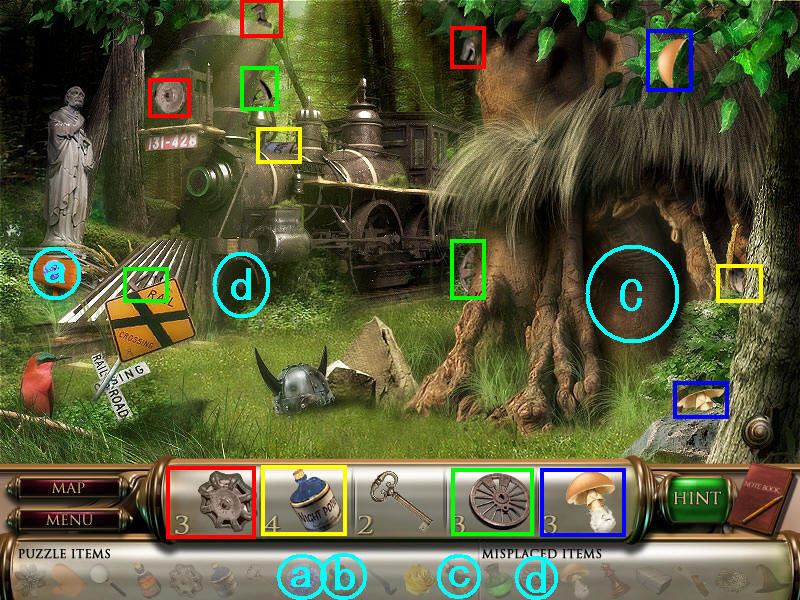 找齐物品1和4,把物品4也就是道具d轮子放在火车下面,找到其余的物品碎片后,先回其他场景完成机关。(道具a蓝花需要拿撬棍撬开场景二的石头获得;b蓝药水在场景二获得,同样要先在a处种蓝花,再用蓝药水浇灌。c黄药水是用来开启C处树屋的,在开启了场景三巫师房间后才能找齐;d火车轮子就这这个场景获得。)图7.4