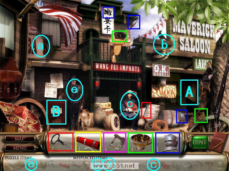 找到下图中的物品,然后把字母N放在a处,空调机放在b处,中国食品给c处的中国人,然后通过A处去下个图。(e处的守卫需要警星才允许你进去,警星是把水獭帽子还给场景二巡逻的人得到的。给守卫之后可以从B处进入另一个图。)图3.4