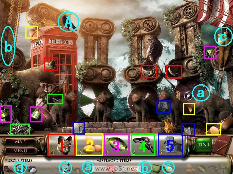 先在下面图中找到所需要物品1、2、3、4的一部分,物品5找齐,然后在A处去另一个场景。(青色框内道具是在后面几个场景中找到再回来摆放的,a梯子在场景三找到放在a处,然后查看B处的旗子得到一页算术题,答案就是场景二需要的电话号码;b和c放在相应的位置。为了解说方便,后面都会把机关和道具放置处用青色框标出,即使还没找齐道具~)图1.1