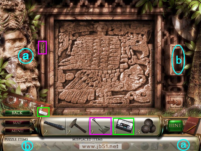 在下图中只找到两个碎片,这样这个场景中就只有铲子缺少一个碎片了,把刚得到的物品4即道具a磁带放在a处。(道具b石像需要完成场景二和三获得,用来开启中间的小游戏。)图4.41