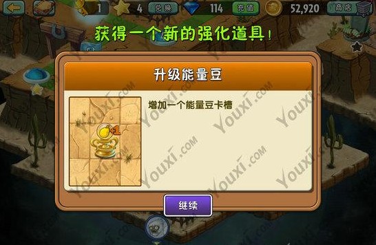 通关后,我们就能获得新的强化道具:升级能量豆。增加一个能量豆卡槽。
