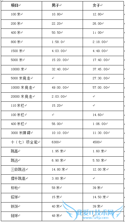 4、以上标准是结合我校实际情况制定。径赛成绩均为手计时。跨栏、投掷项目使用器械均为成人标准。