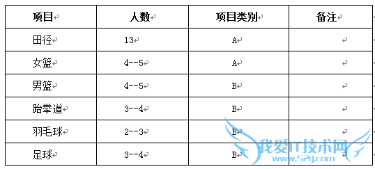 1、我校共有6个招收体育特长生的项目,分为A、B两类。A类项目为:田径、女篮;B类项目为:男篮、羽毛球、跆拳道和足球。
