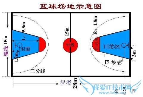 国际篮联标准:整个篮球场地长28米,宽15米.长款之比:28:15.篮圈下沿距地面3.05米.