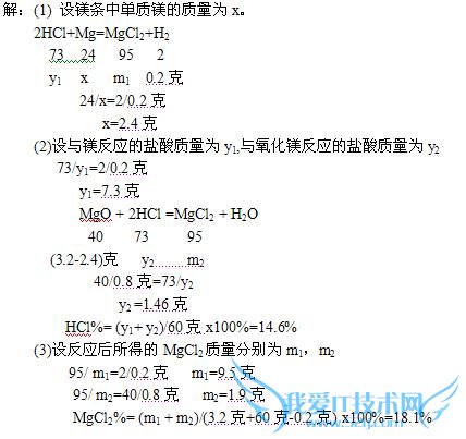 问题2:氧化铜和稀盐酸反应|有表面被氧化的镁条3.2克,跟60克稀盐酸恰好完全反应,生成0.2克氢气.计算:(1)镁条中单质镁的质量;(2)稀盐酸的溶质质量分数;(3)反应后所得溶液的溶质质量分数.[请写[化学科目]