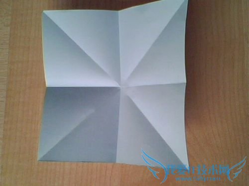 1. 一张正方形的纸,横折一次,竖折一次,对角各折一次,这样留下一个“米”字形的折痕,方便下一个步骤的制作.