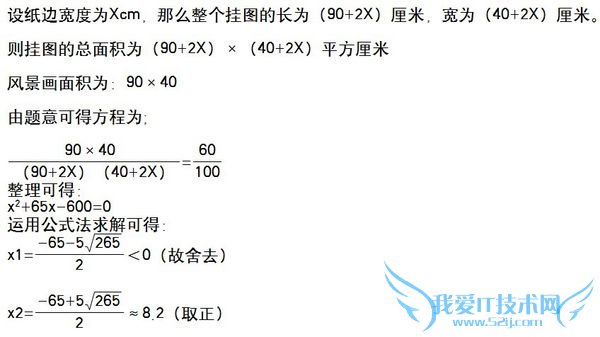 问题4:在一幅长90cm、宽40cm的风景画的四周外围镶上一条宽度相同的金色纸边.请问这个题我哪里做错了?在一幅长90cm、宽40cm的风景画的四周外围镶上一条宽度相同的金色纸边,支撑一副挂图,如果要[数学科目]