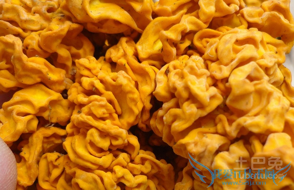金耳俗称黄木耳;子实体半球形,鲜时表面橙黄至橘红色,干后橙黄色至金黄色;干后收缩,坚硬,基本保持原状。金耳菌丝体多糖由鼠李糖、甘露糖、葡萄糖、半乳糖、岩藻糖组成;子实体多糖由葡萄糖、葡萄糖醛酸、甘露糖、木糖、鼠李糖组成。