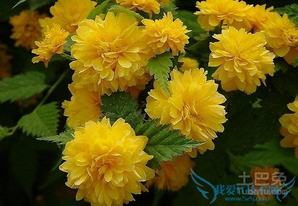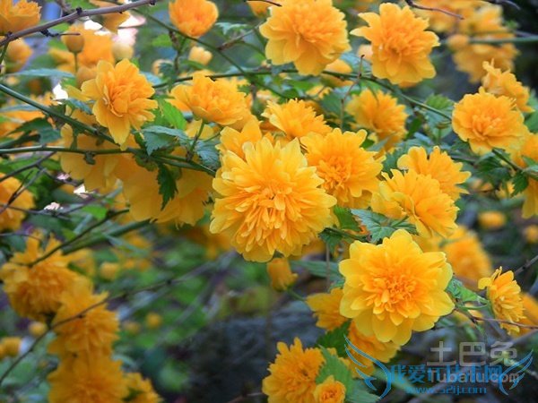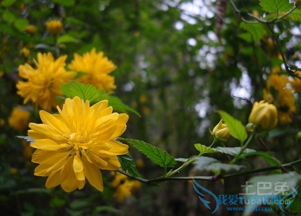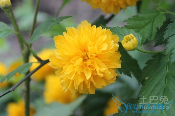 棣棠是一种高度在1-2米左右的落叶灌木,植株呈圆柱形,具有三角形的互生叶片,叶片边缘具有锯齿,叶片上带有稀疏的绒毛。在每年的春季,棣棠会开出金黄色的花朵,花朵通常单生在侧枝的顶端,花朵的直径在3-6厘米左右,花瓣呈椭圆形。