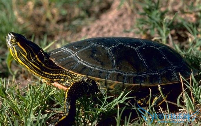 背甲呈深色,稀疏地长着一些淡黄色的网状条纹。每一枚缘盾都有两个深色的长方形图案,并由橙黄色勾勒出它们的轮廓。这种图案也缠绕在缘盾的下方,只是其底色是以红色为主的。腹甲大体上是红色或橙红色的,旁侧有黑色和灰黄色的粗线。有些个体的腹甲上可能会有不定型的“锈斑”,这是由于吸收了水中的化学物质而造成的(Vogt,1981)。这些污斑可以用人工刮除,也可因腹甲盾片的脱落而自然除去。皮肤的底色是深色的,头部,四肢和尾部长有亮黄色的条纹,有时条纹中央还嵌套着红色。头部的黄色条纹较宽,并延伸至眼部和鼻尖部。上颚在鼻孔的正下方有一缺刻。雄龟有很长的前爪,和较粗较长的尾部,泄殖腔的开口超出背甲的边缘。雌龟前爪较短,尾部也较细较短,并且它们的泄殖腔开口不超出背甲的边缘。幼龟和成龟相似,但它们出壳时仅有7/8-11/8英寸。