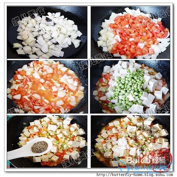 3、 起油锅,先放入洋葱和番茄丁略炒,再放入豌豆和豆腐,加盐、白糖、黑胡椒碎,炒3-4分钟,加味精调匀即可。