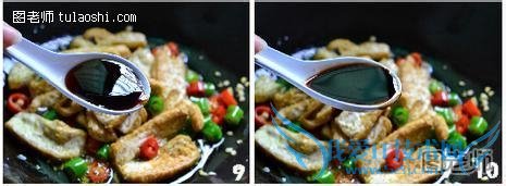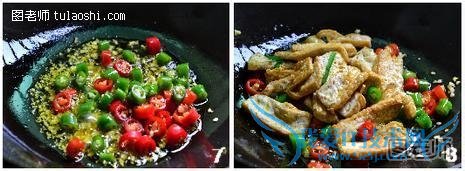 7.下入辣椒圈炒香。8.下入炸好的豆腐。