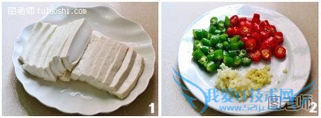 1.老豆腐洗净切块。2.辣椒切圈,姜蒜切末。