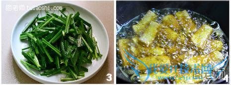 3.韭菜洗净切段。4.锅中烧热油,下入豆腐炸制。
