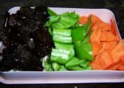 9. 加入胡萝卜 尖椒 木耳烧至汤汁浓缩,加入鸡精调味即可。