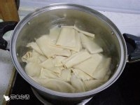 菠菜焯水备用。 干豆腐用开水烫一下备用。