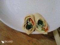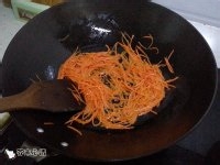 胡萝卜丝用油炒到金黄色备用。干豆腐上面放上事先备好的菠菜、葱丝、胡萝卜丝。