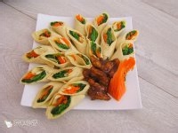 这个也摆好(这个摆成孔雀的形状)。前面的头部就是我用刨丝器刨胡萝卜后天然形成的哈哈,我没有另外加工。最后在中间的部分倒入肉丝酱。
