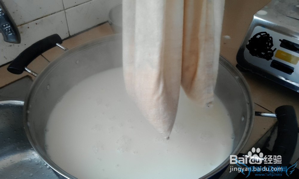 1.将打好的豆浆放在火上烧开,然后倒入放有纱布袋中盆中过滤豆渣,过滤好的豆渣本人一般会再放一碗水倒入豆浆过滤袋内再用手挤压过滤一次,这时的豆浆浓度也是很高的,然后将2次过滤好的黄豆水烧开。(在黄豆水烧开过程中可以准备两个大一些的盆,同时将溶化成水的食用石膏水倒到其中一个备用盆中。)