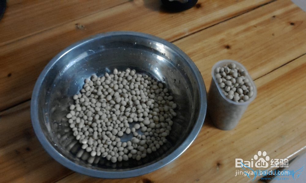 黄豆可不去壳,如果有条件最好去壳,用160mL的米筒量出2杯(够三口之家一餐食用了),然后用水泡6~10小时,用水量不用太多,打出来的豆浆约2.5L左右就好。