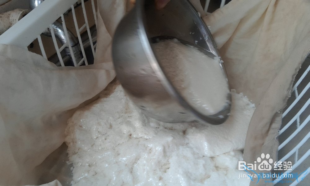 将豆腐花放半个小时等有些稍凉用碗或勺将豆腐花面上的石膏轻轻刮掉一点,然后将豆腐花倒入用豆腐过滤袋垫好的菜蓝中(PS:这个豆腐花可以根椐口味加糖或盐直接吃哦,也是一种美味),