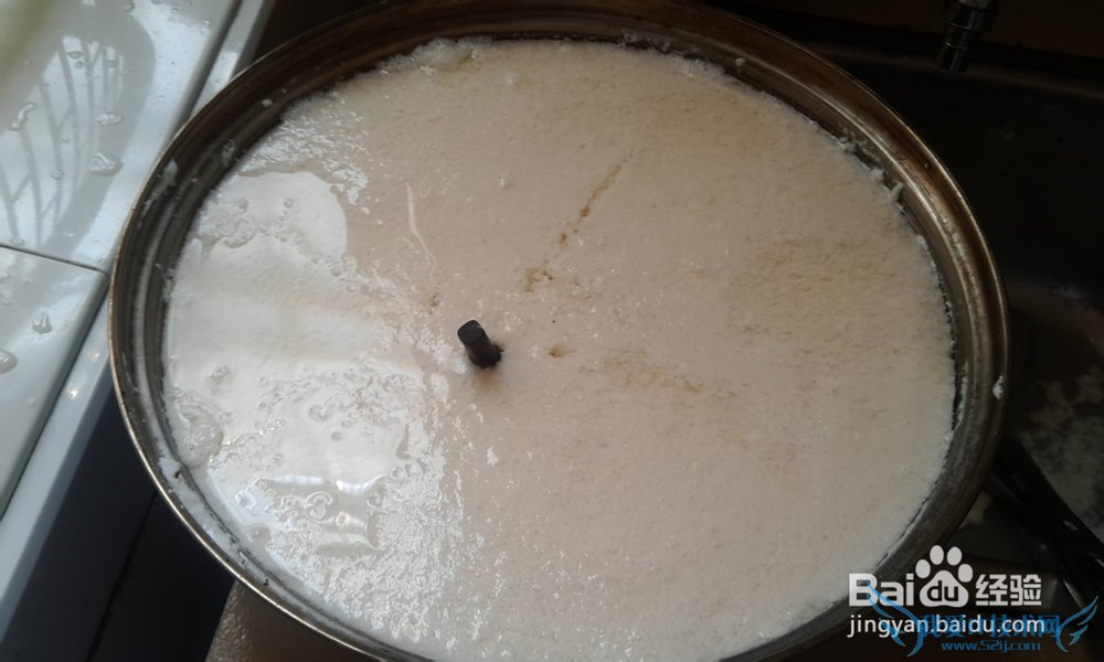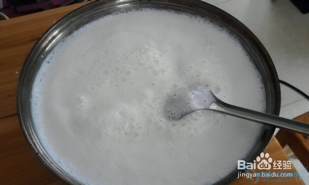 2.在豆浆烧开时用手将有食用石膏水搅一搅(因为食用石膏水稍放一会就容易沉淀),然后将烧开的豆浆倒入此盆中,然后马上再倒入另外一个备用的盆中,倒入后将不要再动(PS:可以将截短后的筷子垂直自由落下,筷子不倒的说明肯定能做成豆腐,如果倒下了在豆浆上撒上少许石膏粉)。