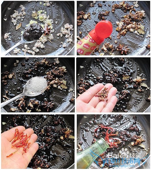 11.加入一勺豆瓣酱,一点老抽,半勺白糖和几粒花椒(或者花椒粉)