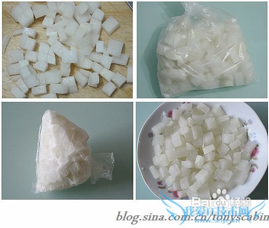 5.第二天把冷冻好的萝卜丁拿出放在盘里让其融解,里面的水不要倒掉;